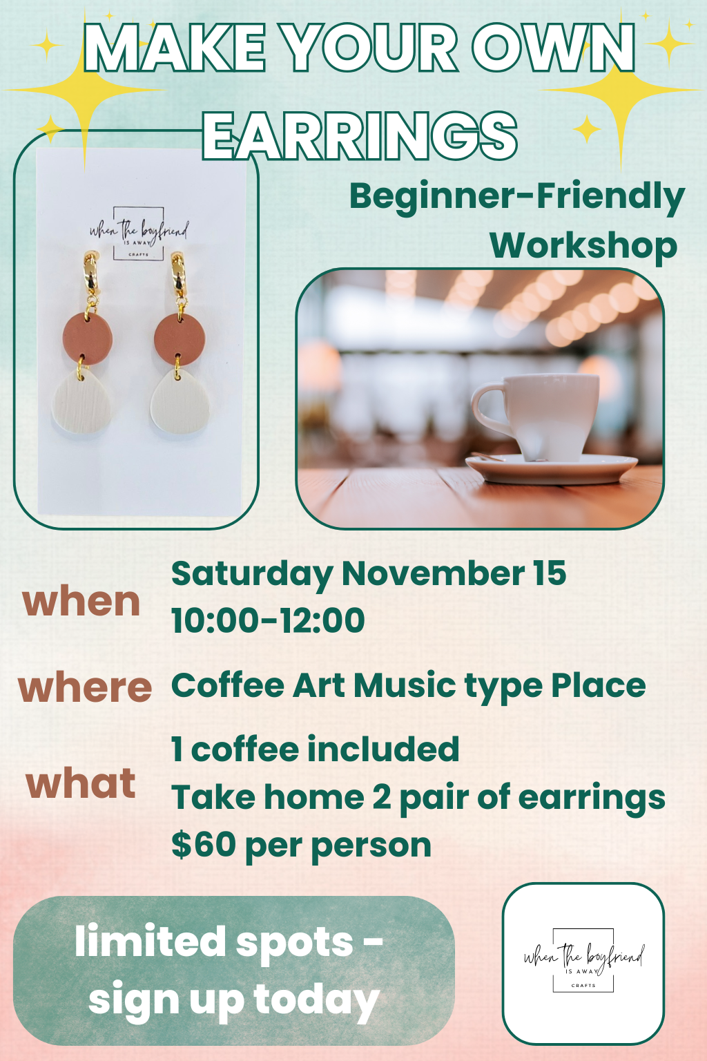 Join us for a relaxing, beginner-friendly morning of creativity! Learn how to design and craft your own polymer clay earrings while enjoying coffee and good company. You’ll leave with two pairs of handmade earrings — designed by you — and the confidence to keep creating more at home!